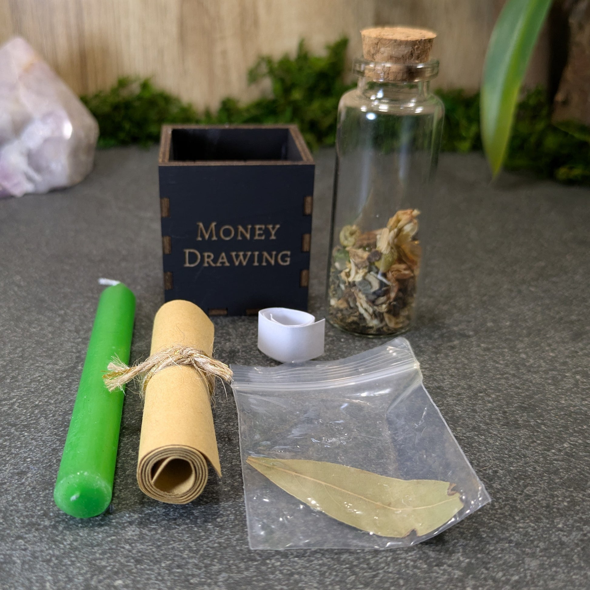 Looking to attract abundance and prosperity into your life? Our Money Drawing Spell Kit is just what you need. This powerful kit contains everything you need to cast a spell to draw financial success and good fortune into your life. Included are detailed instructions, herbs, candles, and crystals specifically chosen to amplify the energy of wealth and abundance. Whether you're looking to increase your income, attract new opportunities, or simply want to bring in some extra cash, this kit is the perfect tool to help you manifest your financial goals. Start manifesting the life of your dreams today with our Money Drawing Spell Kit.